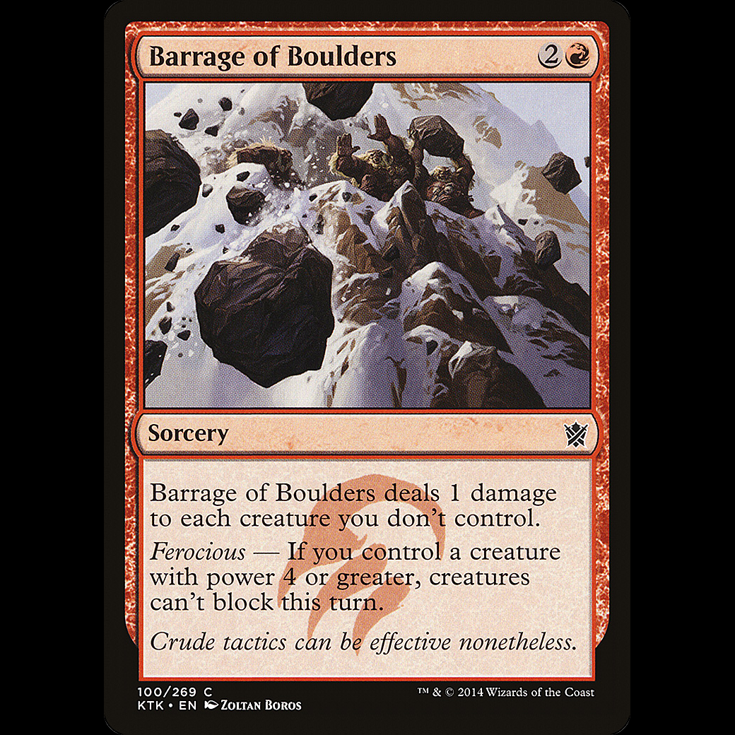MTG Barrage of Boulders Khans of TarkirBarrage of Boulders deals 1 damage to each creature you don't control. Ferocious — If you control a creature with power 4 or greater, creatures can't block this turn.