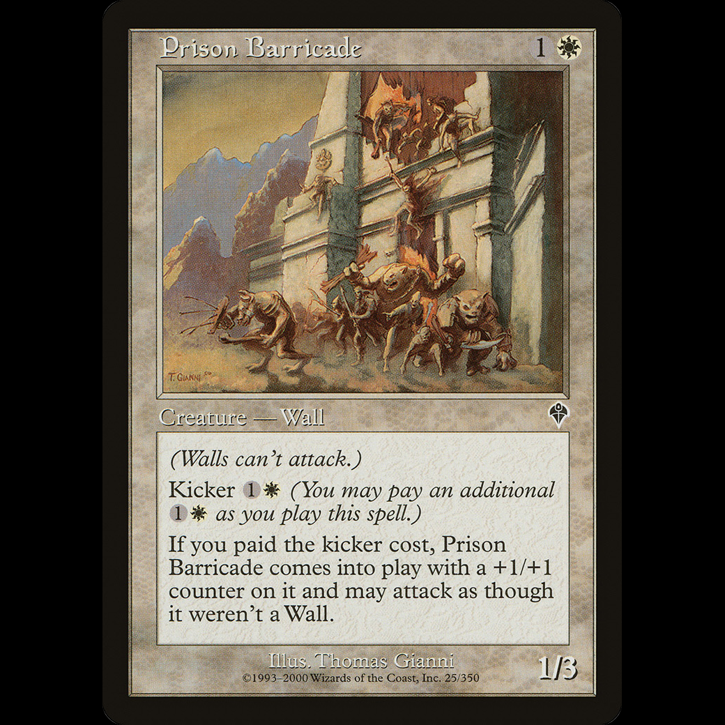 MTG Prison Barricade InvasionDefender (This creature can't attack.) Kicker (You may pay an additional as you cast this spell.) If Prison Barricade was kicked, it enters the battlefield with a +1/+1 counter on it and with