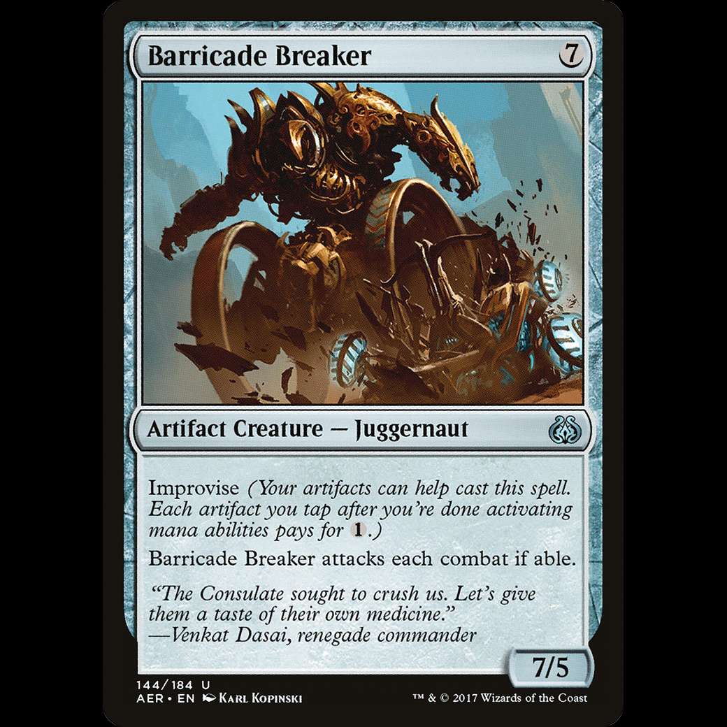 MTG Barricade Breaker Aether RevoltImprovise (Your artifacts can help cast this spell. Each artifact you tap after you're done activating mana abilities pays for .) Barricade Breaker attacks each combat if able.