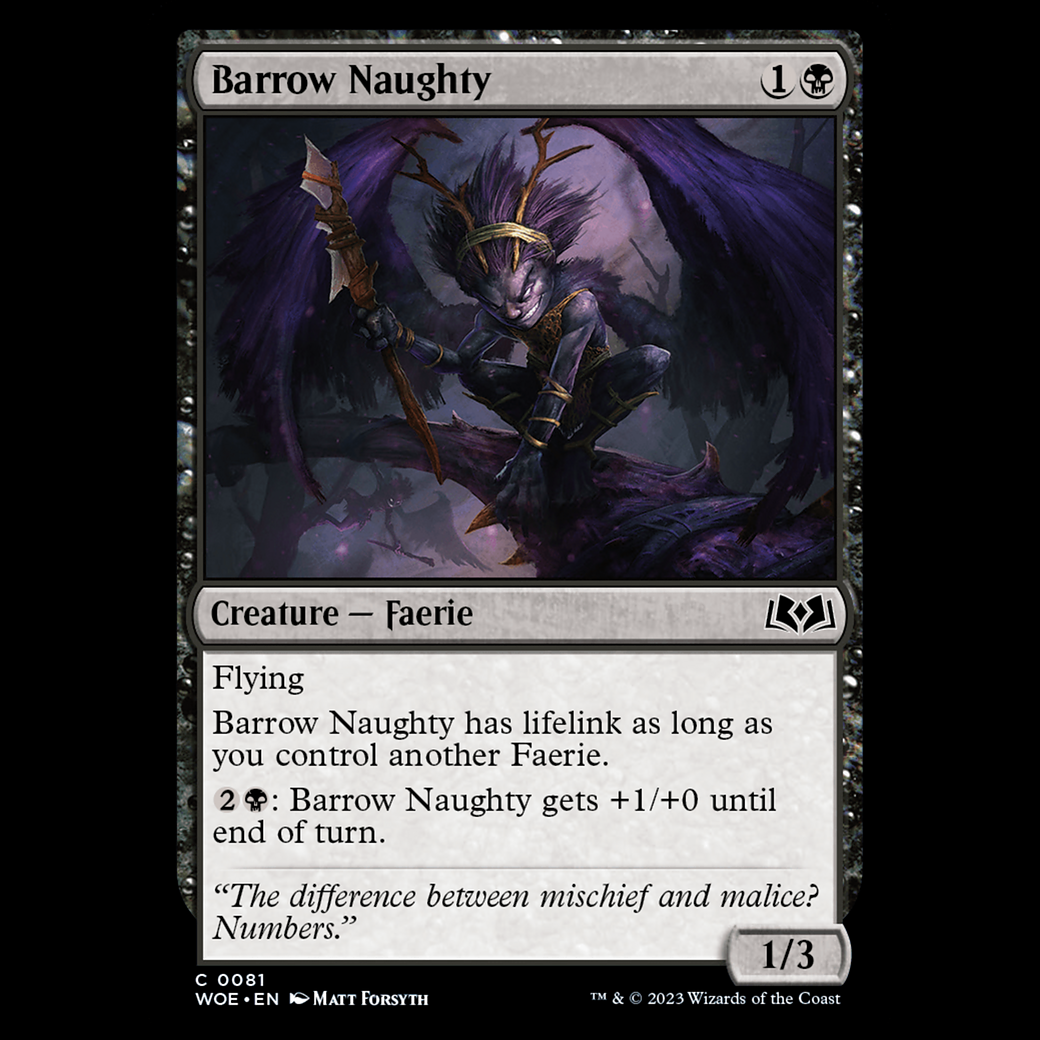 MTG Barrow Naughty Wilds of EldraineFlying Barrow Naughty has lifelink as long as you control another Faerie. : Barrow Naughty gets +1/+0 until end of turn.