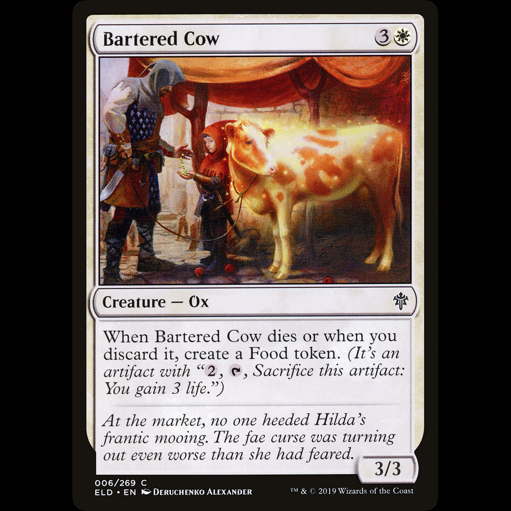 MTG Bartered Cow Throne of Eldraine eld#6When this creature dies and when you discard this card, create a Food token. (It's an artifact with ", , Sacrifice this token: You gain 3 life.")