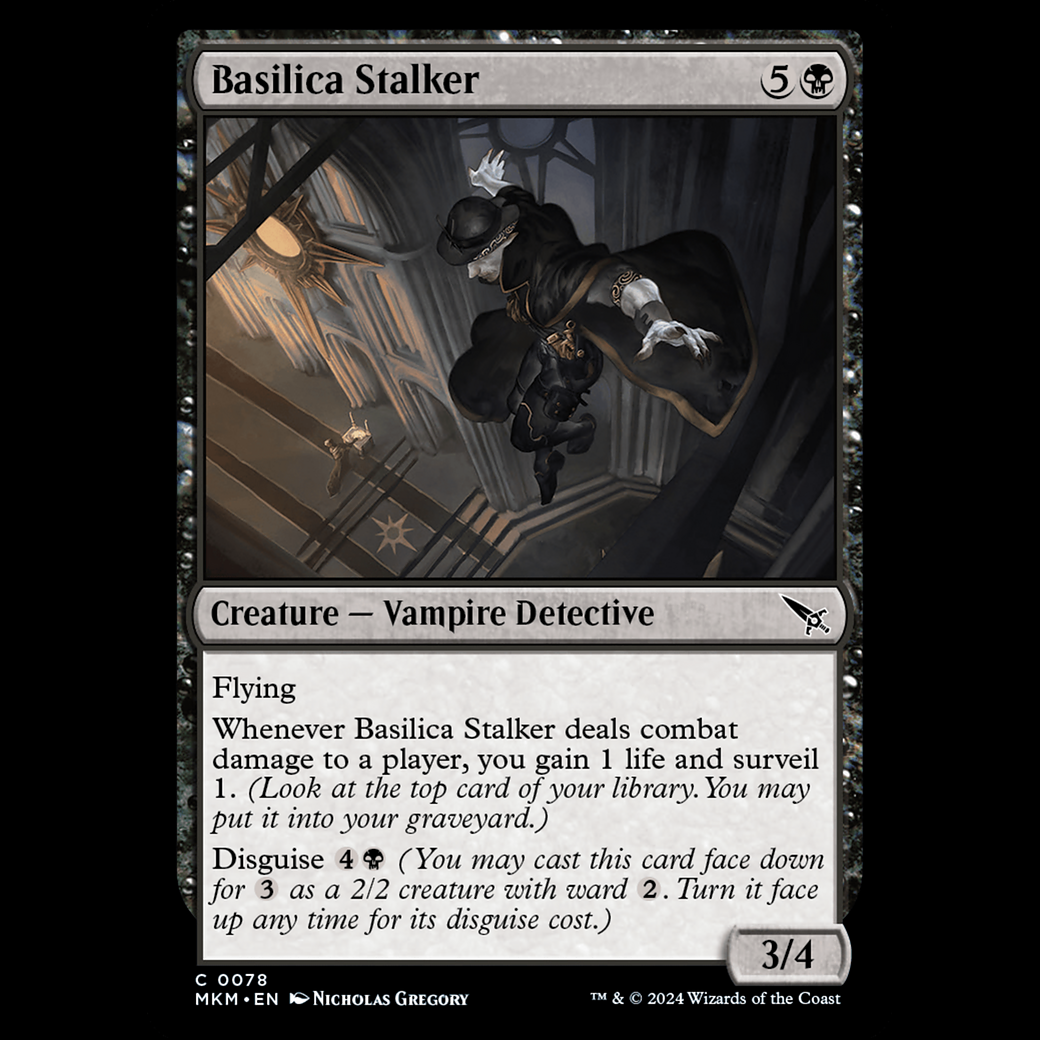Whenever Basilica Stalker deals combat damage to a player, you gain 1 life and surveil 1. (Look at the top card of your library. You may put it into your graveyard.)