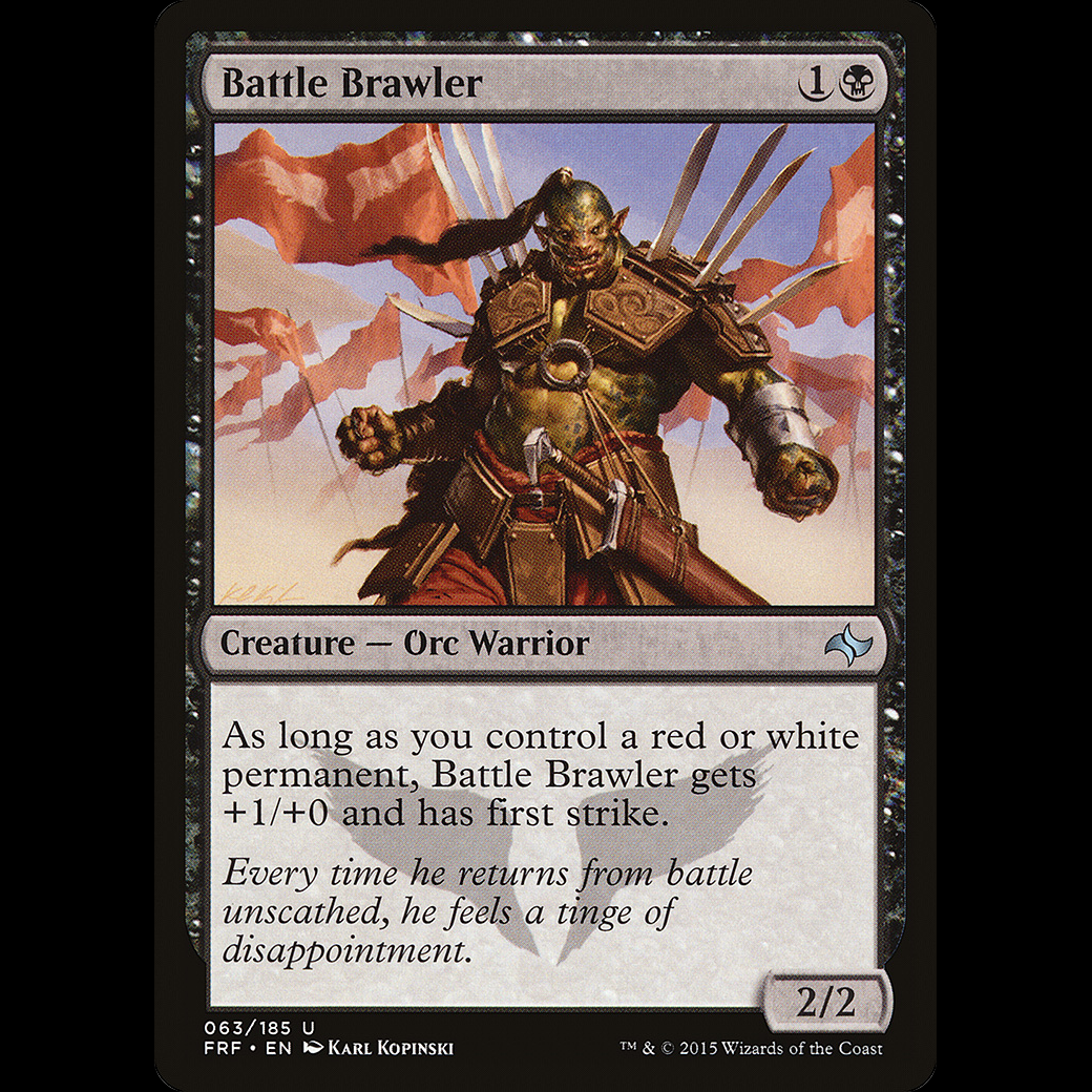 As long as you control a red or white permanent, Battle Brawler gets +1/+0 and has first strike.