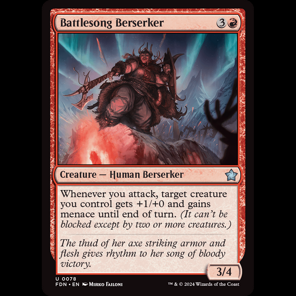Whenever you attack, target creature you control gets +1/+0 and gains menace until end of turn. (It can't be blocked except by two or more creatures.)