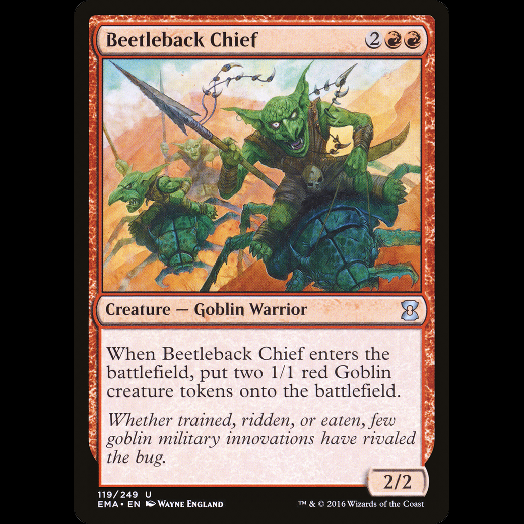 When Beetleback Chief enters the battlefield, create two 1/1 red Goblin creature tokens.