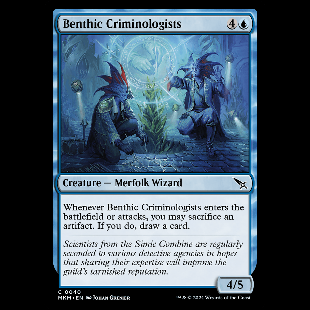 Whenever Benthic Criminologists enters the battlefield or attacks, you may sacrifice an artifact. If you do, draw a card.