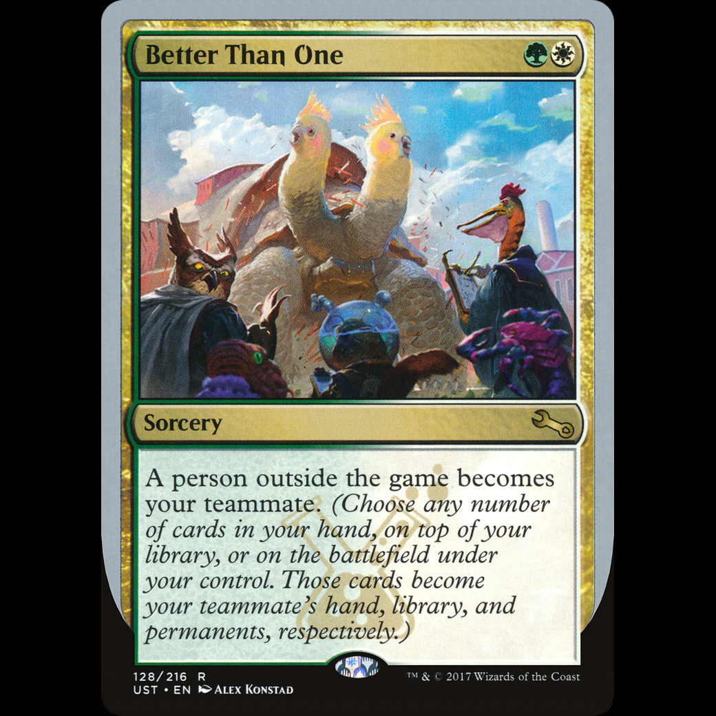 A person outside the game becomes your teammate. (Choose any number of cards in your hand, on top of your library, or on the battlefield under your control. Those cards become your teammate's hand, library, and permanents, respectively.)