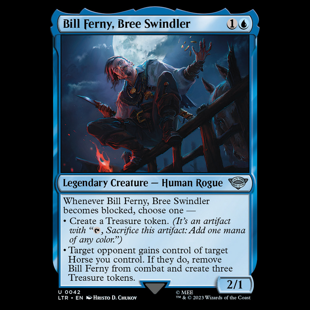 • Target opponent gains control of target Horse you control. If they do, remove Bill Ferny from combat and create three Treasure tokens.