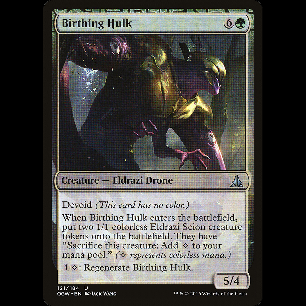 When Birthing Hulk enters the battlefield, create two 1/1 colorless Eldrazi Scion creature tokens. They have