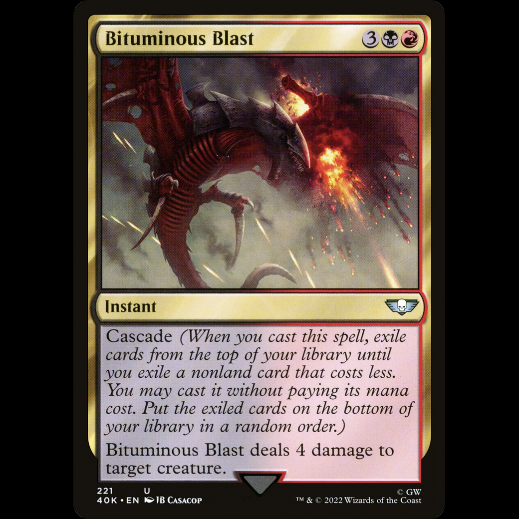 MTG Bituminous Blast Warhammer 40,000 Commander 40k#221 Cascade (When you cast this spell, exile cards from the top of your library until you exile a nonland card that costs less. You may cast it without paying its mana cost. Put the exiled cards on the bottom in a random order.) Bituminous Blast deals 4 damage to target creature.