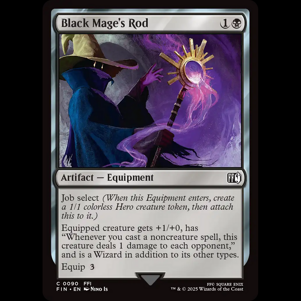 Equipped creature gets +1/+0, has "Whenever you cast a noncreature spell, this creature deals 1 damage to each opponent," and is a Wizard in addition to its other types.