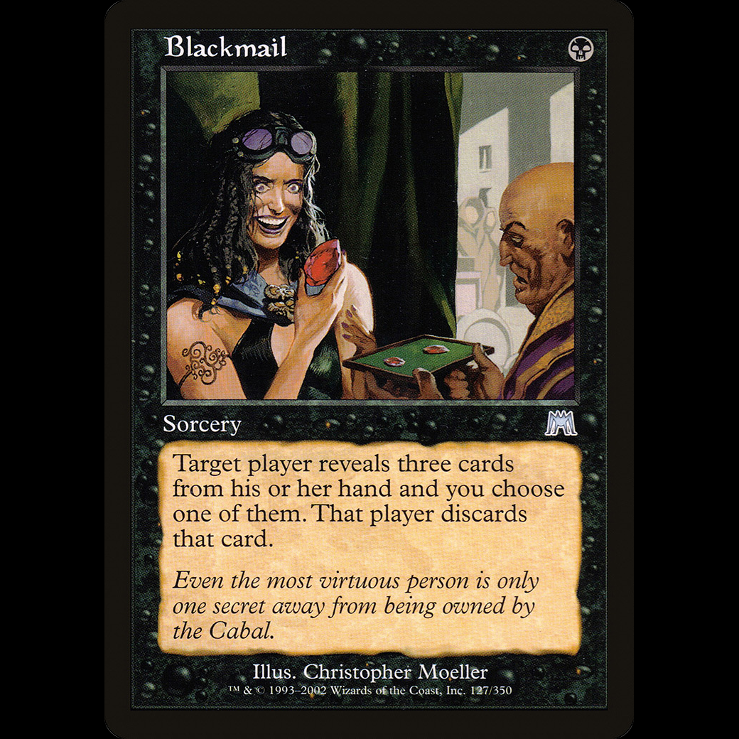 Target player reveals three cards from their hand and you choose one of them. That player discards that card.