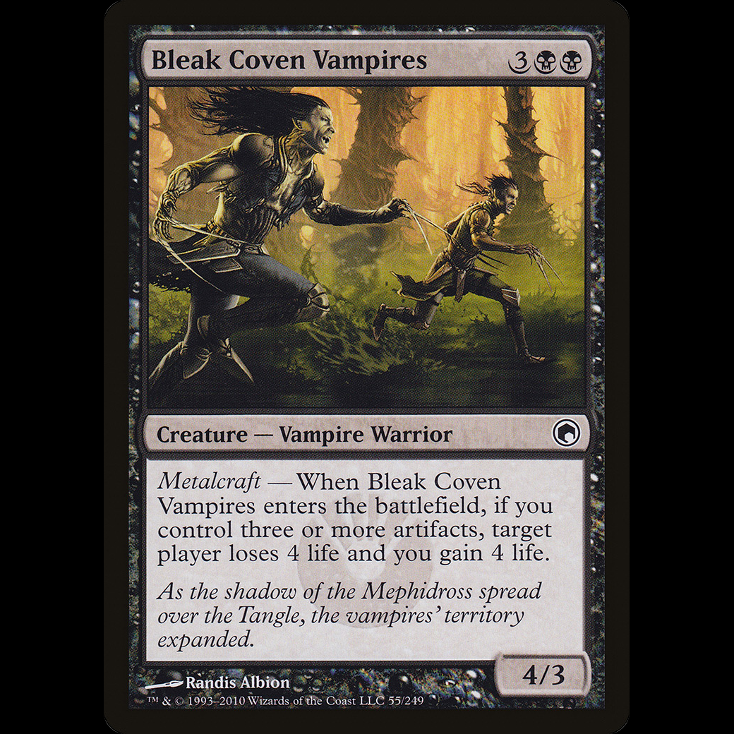 Metalcraft — When Bleak Coven Vampires enters the battlefield, if you control three or more artifacts, target player loses 4 life and you gain 4 life.