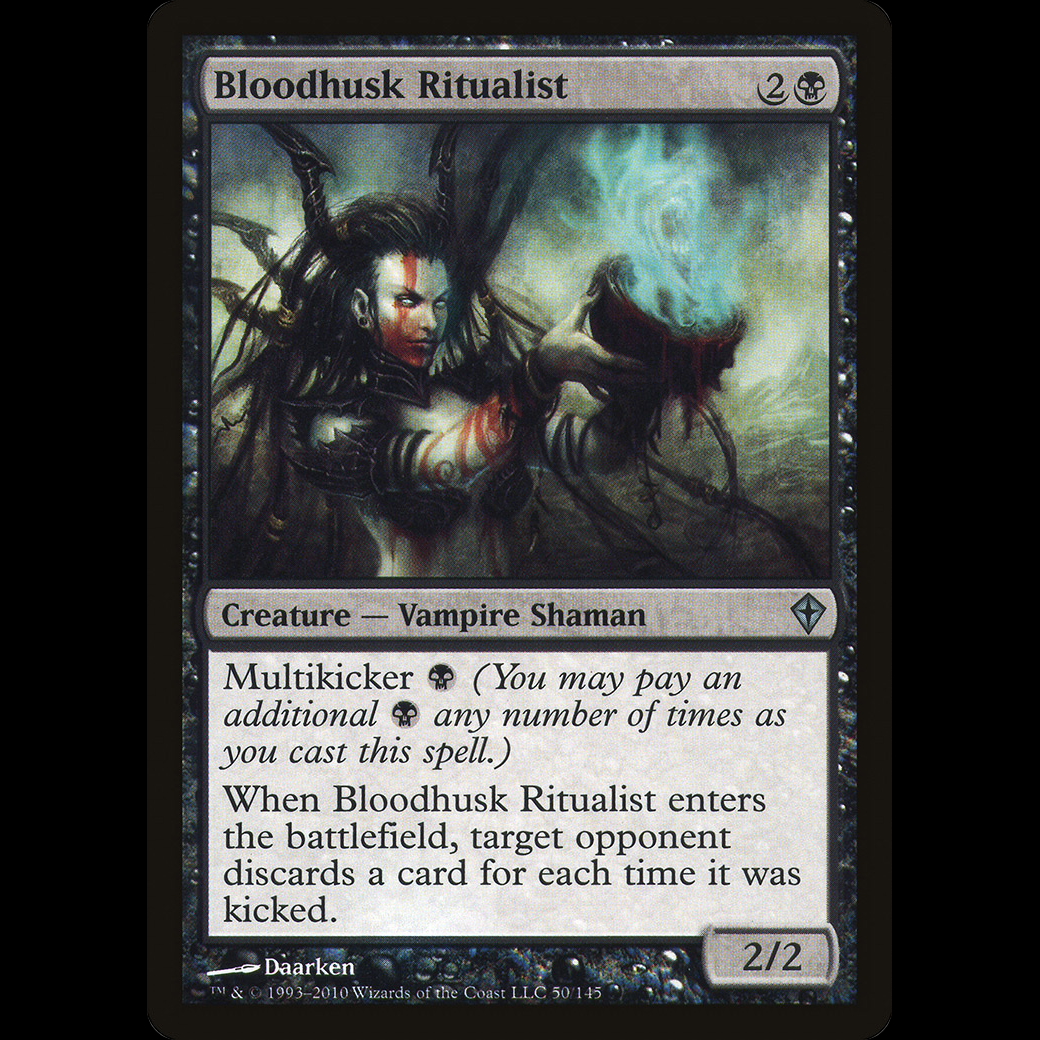 When Bloodhusk Ritualist enters the battlefield, target opponent discards a card for each time it was kicked.