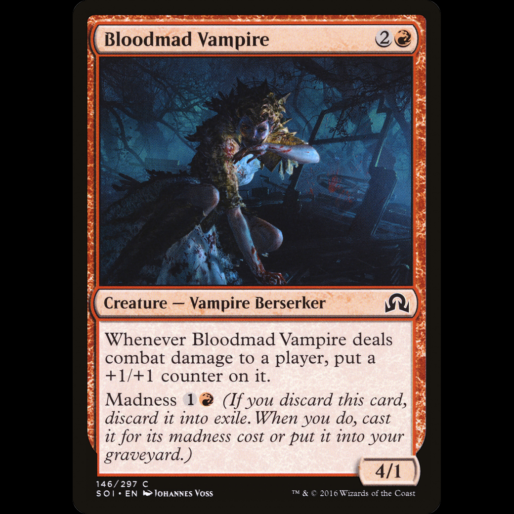 Whenever Bloodmad Vampire deals combat damage to a player, put a +1/+1 counter on it.