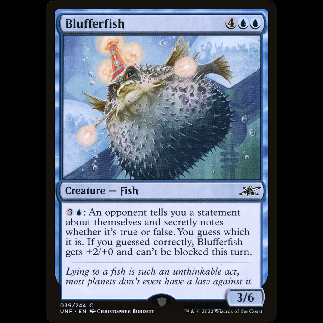 : An opponent tells you a statement about themselves and secretly notes whether it's true or false. You guess which it is. If you guessed correctly, this creature gets +2/+0 and can't be blocked this turn.