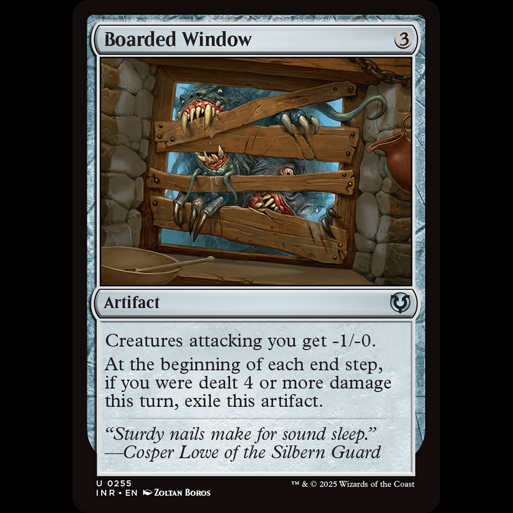 At the beginning of each end step, if you were dealt 4 or more damage this turn, exile Boarded Window.