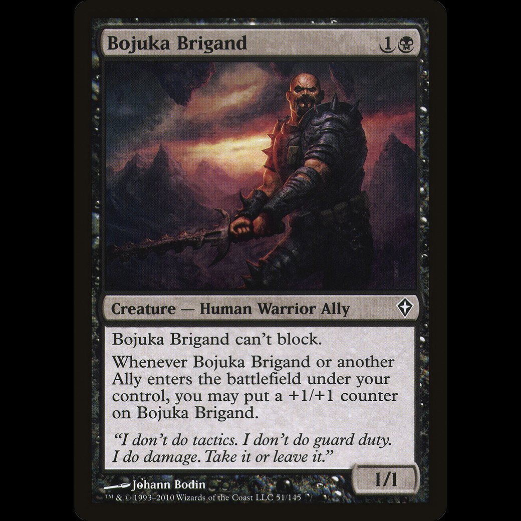 Whenever Bojuka Brigand or another Ally enters the battlefield under your control, you may put a +1/+1 counter on Bojuka Brigand.