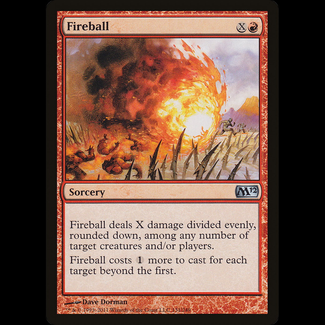 Fireball deals X damage divided evenly, rounded down, among any number of targets.