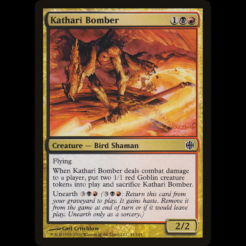 When Kathari Bomber deals combat damage to a player, create two 1/1 red Goblin creature tokens and sacrifice Kathari Bomber.