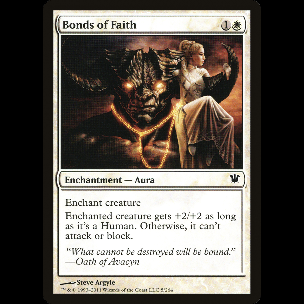Enchanted creature gets +2/+2 as long as it's a Human. Otherwise, it can't attack or block.