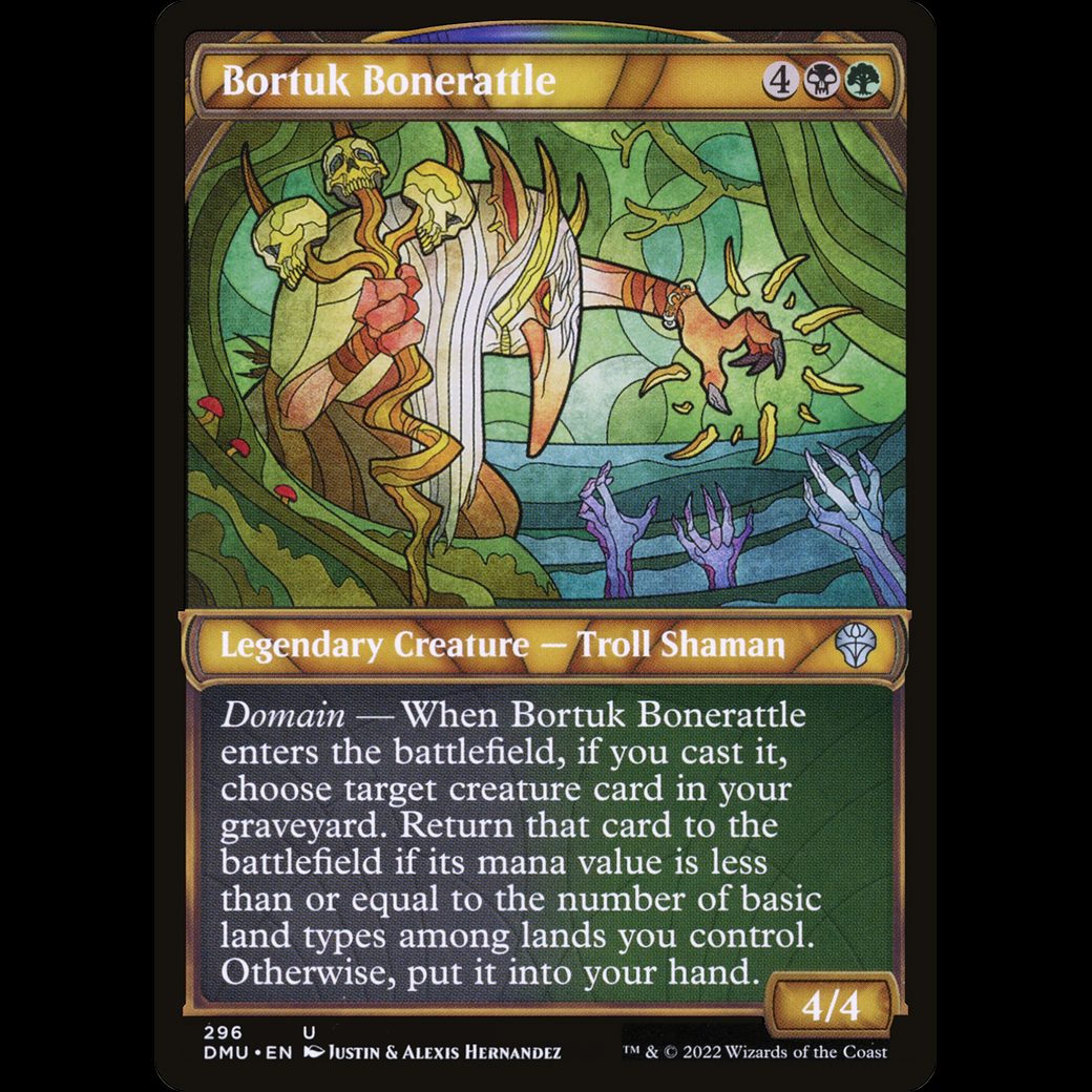 Domain — When Bortuk Bonerattle enters, if you cast it, choose target creature card in your graveyard. Return that card to the battlefield if its mana value is less than or equal to the number of basic land types among lands you control. Otherwise, put it into your hand.