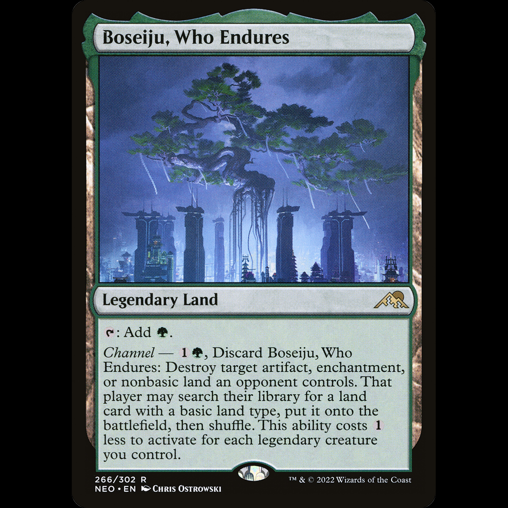 Channel — , Discard Boseiju, Who Endures: Destroy target artifact, enchantment, or nonbasic land an opponent controls. That player may search their library for a land card with a basic land type, put it onto the battlefield, then shuffle. This ability costs less to activate for each legendary creature you control.