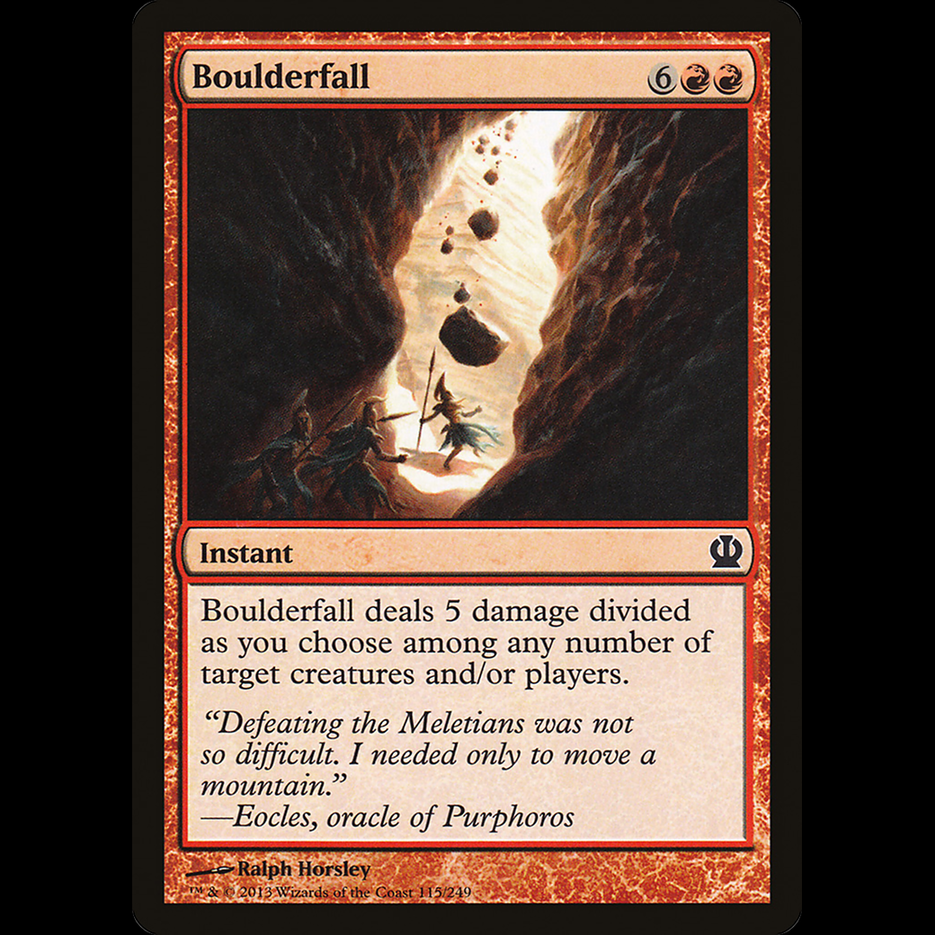 Boulderfall deals 5 damage divided as you choose among any number of targets.