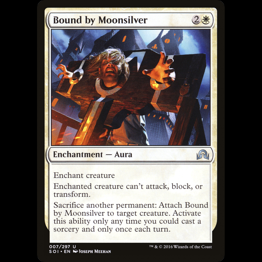 Sacrifice another permanent: Attach Bound by Moonsilver to target creature. Activate only as a sorcery and only once each turn.
