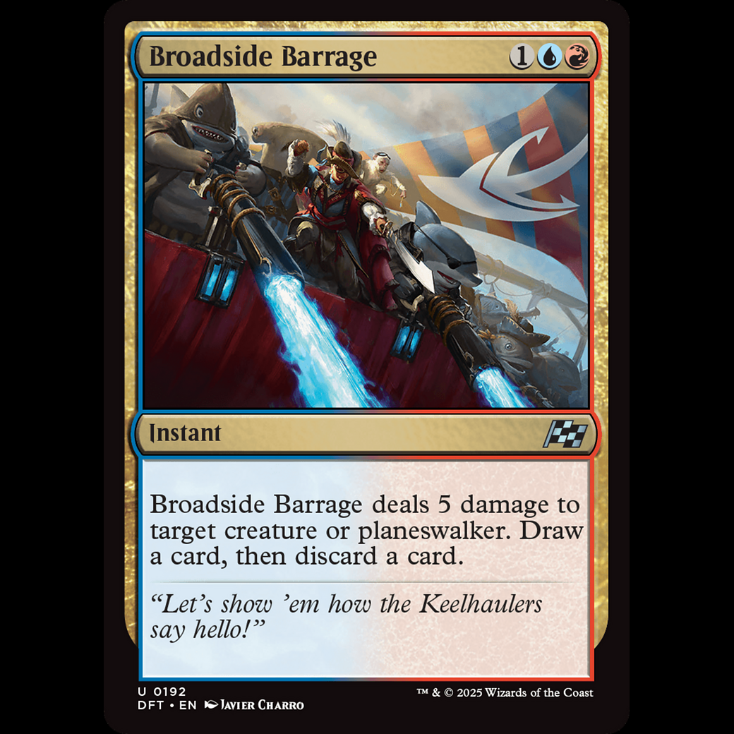 MTG Broadside Barrage Aetherdrift dft#192Broadside Barrage deals 5 damage to target creature or planeswalker. Draw a card, then discard a card.