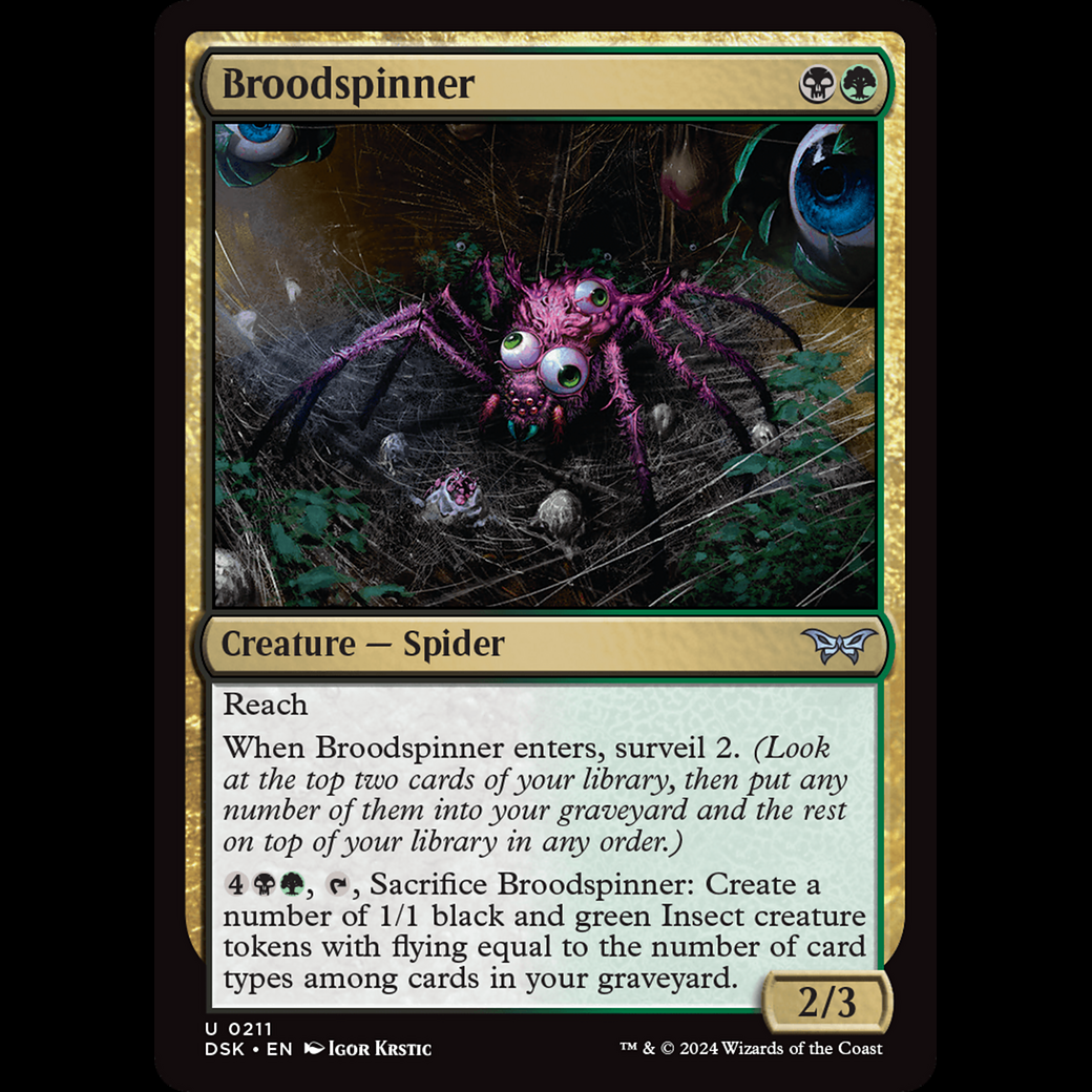 Reach When Broodspinner enters, surveil 2. (Look at the top two cards of your library, then put any number of them into your graveyard and the rest on top of your library in any order.) , , Sacrifice Broodspinner: Create a number of 1/1 black and green Insect creature tokens with flying equal to the number of card types among cards in your graveyard.