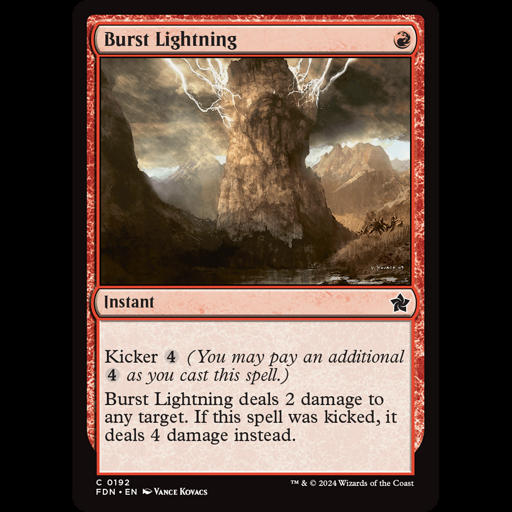Burst Lightning deals 2 damage to any target. If this spell was kicked, it deals 4 damage instead.