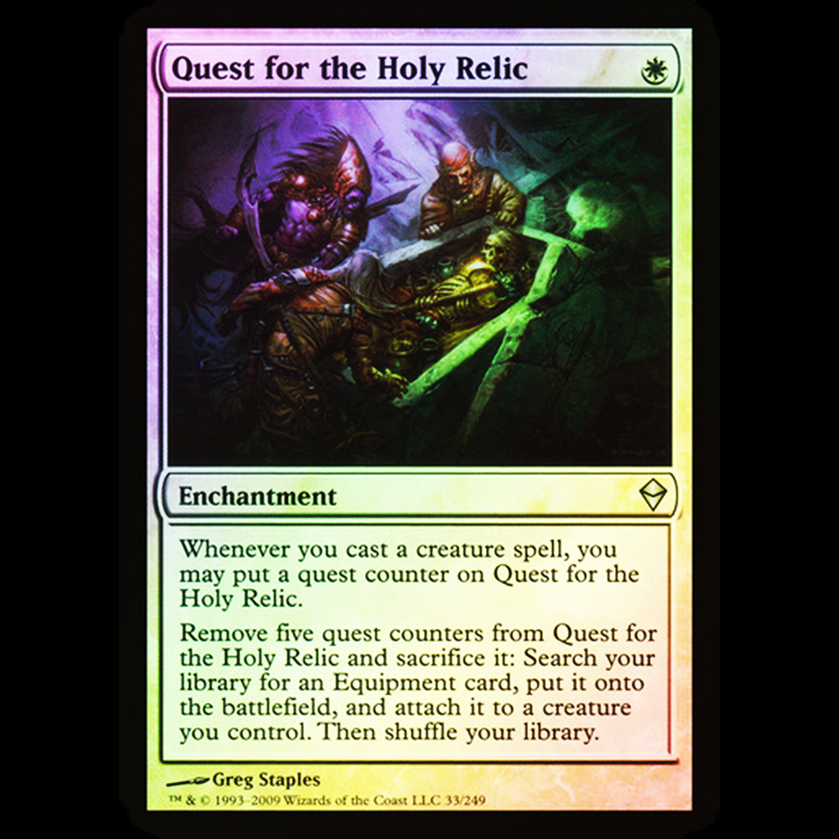 Remove five quest counters from Quest for the Holy Relic and sacrifice it: Search your library for an Equipment card, put it onto the battlefield, attach it to a creature you control, then shuffle.