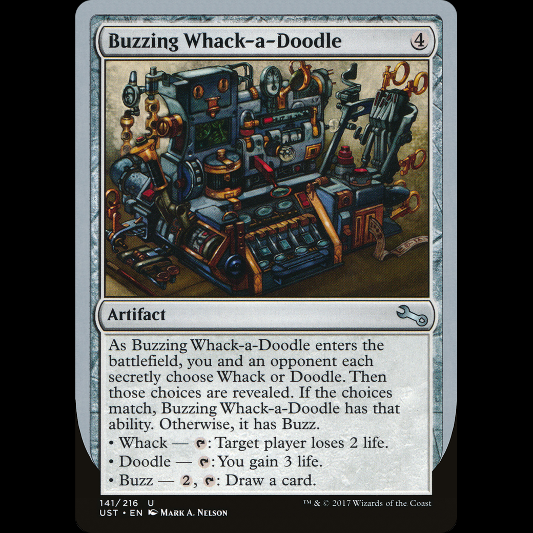 As this artifact enters, you and an opponent each secretly choose Whack or Doodle. Then those choices are revealed. If the choices match, this artifact has that ability. Otherwise, it has Buzz.