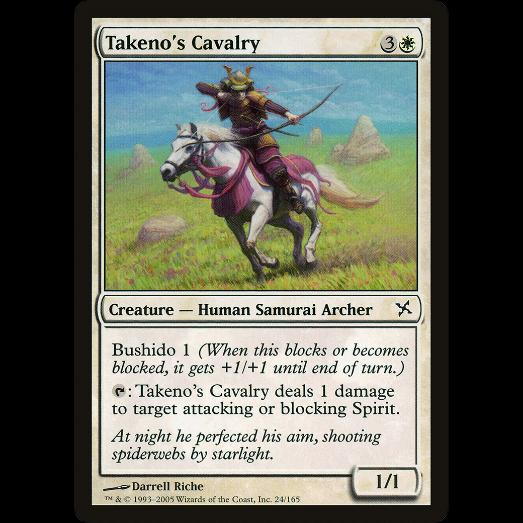 : Takeno's Cavalry deals 1 damage to target attacking or blocking Spirit.