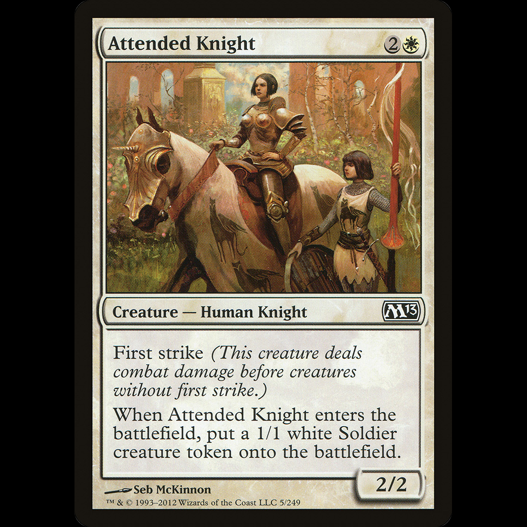 When Attended Knight enters the battlefield, create a 1/1 white Soldier creature token.