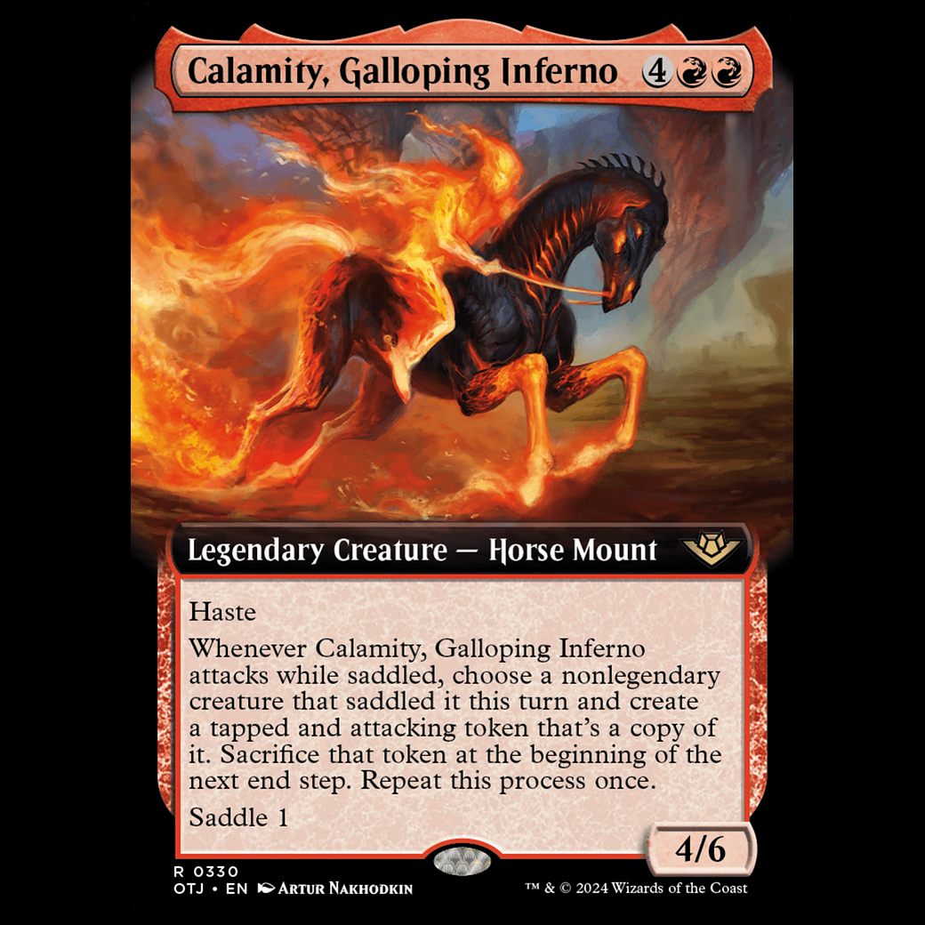 Whenever Calamity, Galloping Inferno attacks while saddled, choose a nonlegendary creature that saddled it this turn and create a tapped and attacking token that's a copy of it. Sacrifice that token at the beginning of the next end step. Repeat this process once.