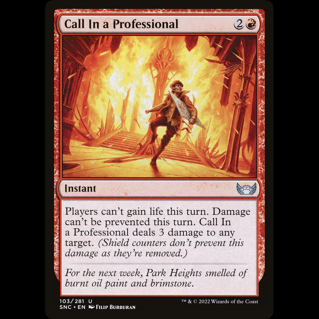 Players can't gain life this turn. Damage can't be prevented this turn. Call In a Professional deals 3 damage to any target. (Shield counters don't prevent this damage as they're removed.)