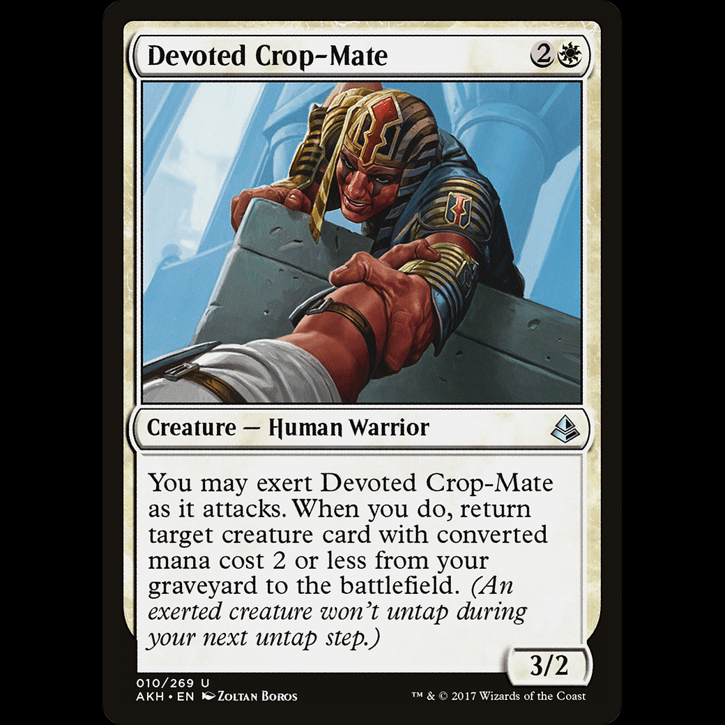 You may exert Devoted Crop-Mate as it attacks. When you do, return target creature card with mana value 2 or less from your graveyard to the battlefield. (An exerted creature won't untap during your next untap step.)