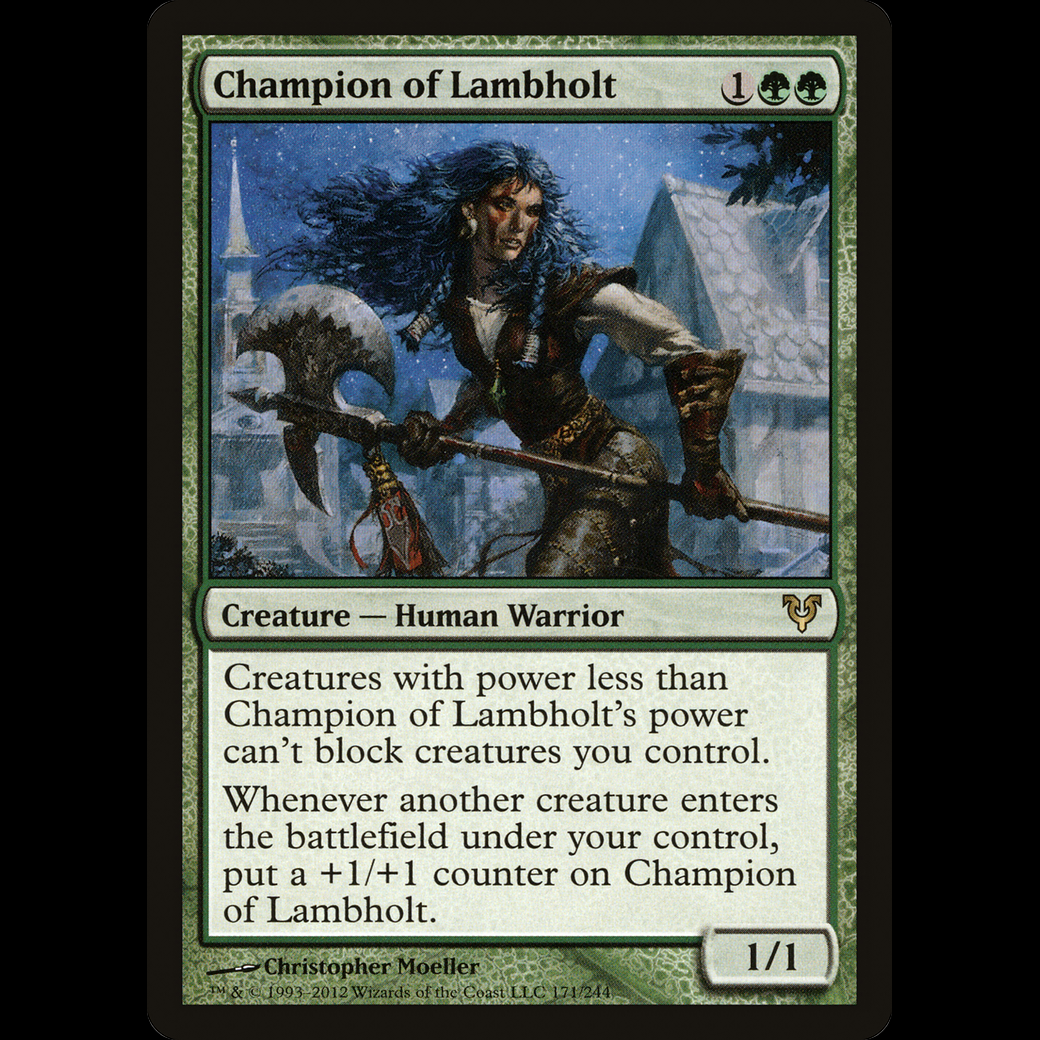 Creatures with power less than Champion of Lambholt's power can't block creatures you control.