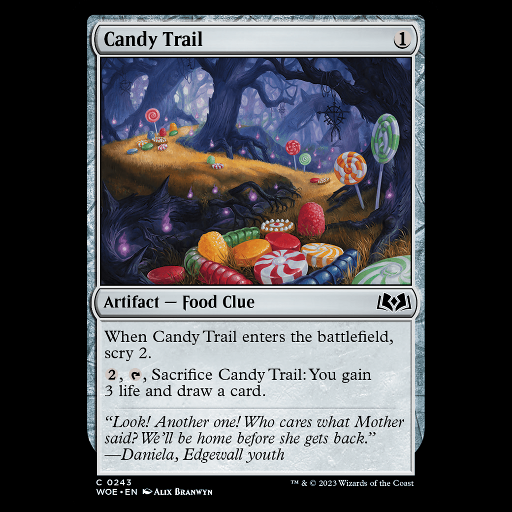MTG Candy Trail Wilds of Eldraine When Candy Trail enters the battlefield, scry 2. , , Sacrifice Candy Trail: You gain 3 life and draw a card.