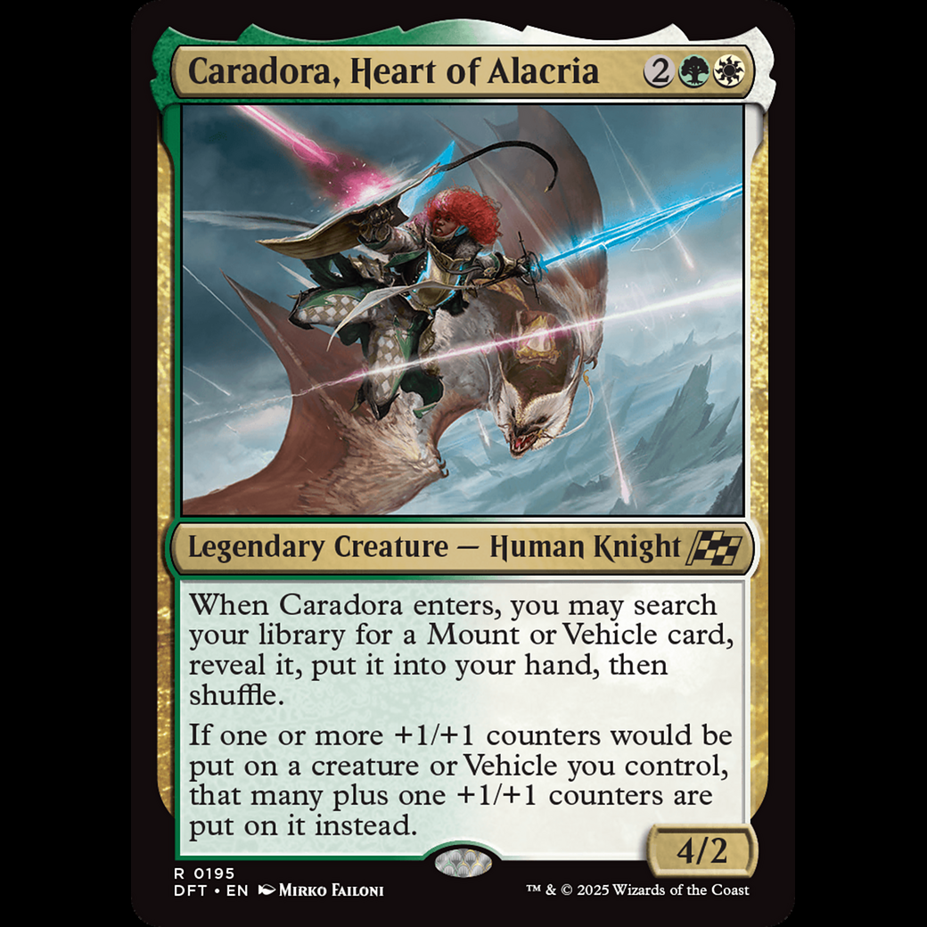 When Caradora enters, you may search your library for a Mount or Vehicle card, reveal it, put it into your hand, then shuffle.