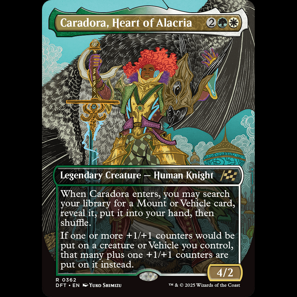 When Caradora enters, you may search your library for a Mount or Vehicle card, reveal it, put it into your hand, then shuffle.