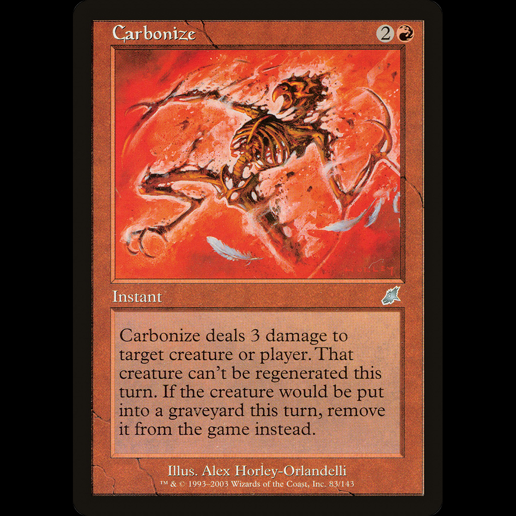 Carbonize deals 3 damage to any target. If it's a creature, it can't be regenerated this turn, and if it would die this turn, exile it instead.
