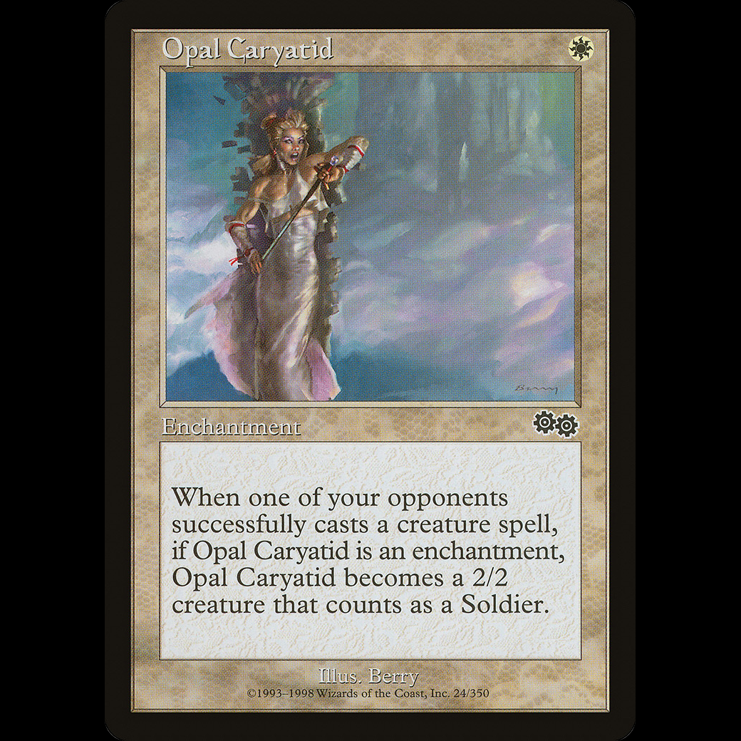 When an opponent casts a creature spell, if Opal Caryatid is an enchantment, Opal Caryatid becomes a 2/2 Soldier creature.