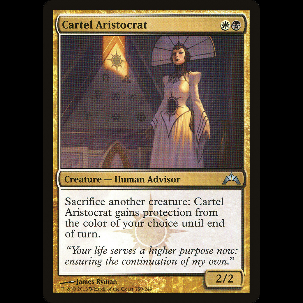 Sacrifice another creature: Cartel Aristocrat gains protection from the color of your choice until end of turn.