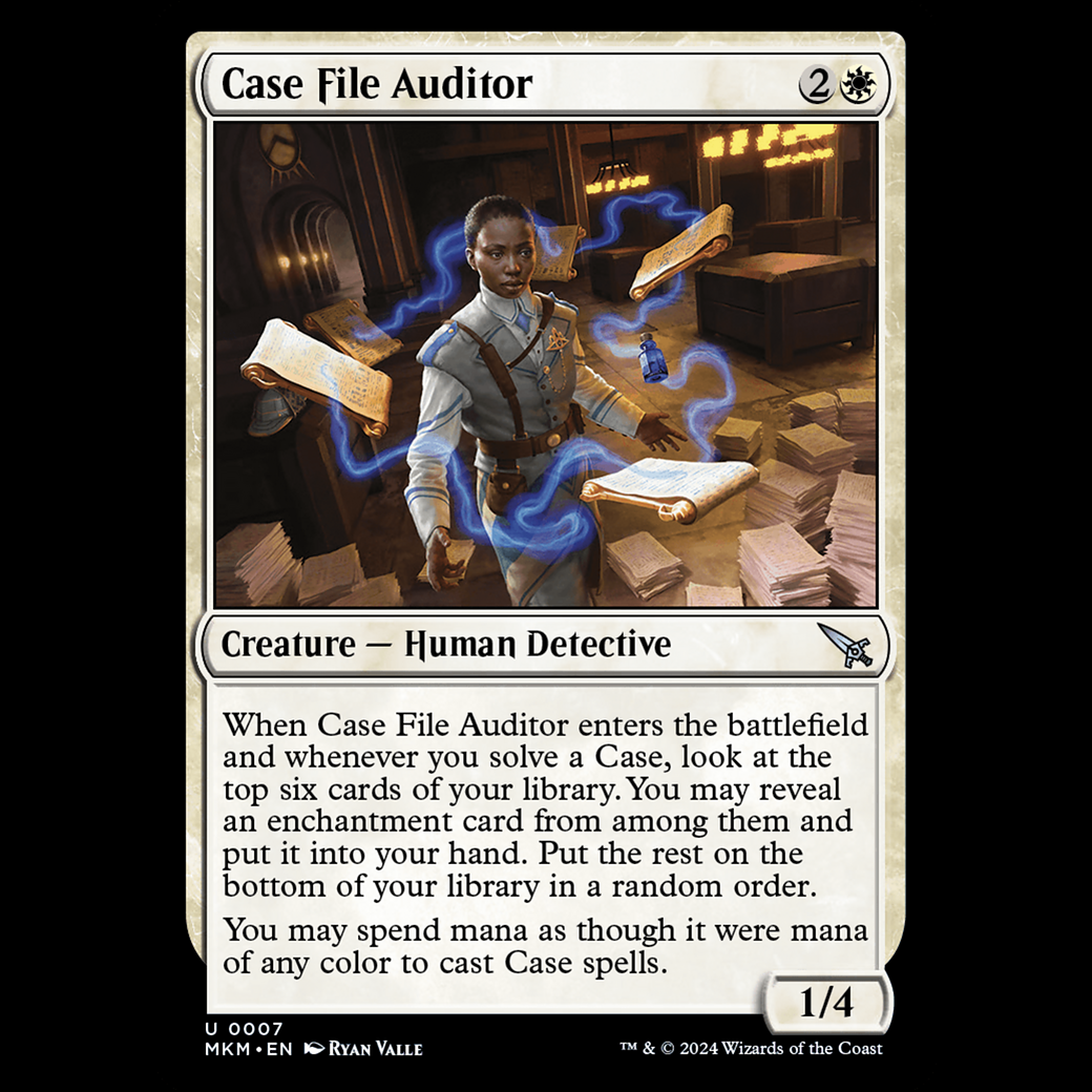 When Case File Auditor enters the battlefield and whenever you solve a Case, look at the top six cards of your library. You may reveal an enchantment card from among them and put it into your hand. Put the rest on the bottom of your library in a random order.
