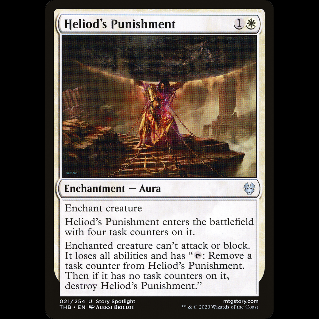 Enchanted creature can't attack or block. It loses all abilities and has ": Remove a task counter from Heliod's Punishment. Then if it has no task counters on it, destroy Heliod's Punishment."