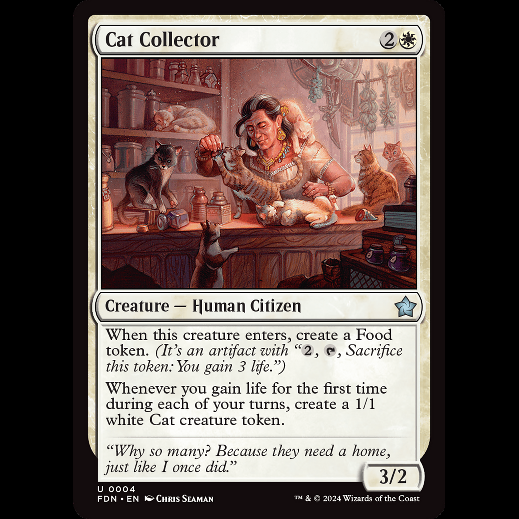 When this creature enters, create a Food token. (It's an artifact with ", , Sacrifice this token: You gain 3 life.") Whenever you gain life for the first time during each of your turns, create a 1/1 white Cat creature token.