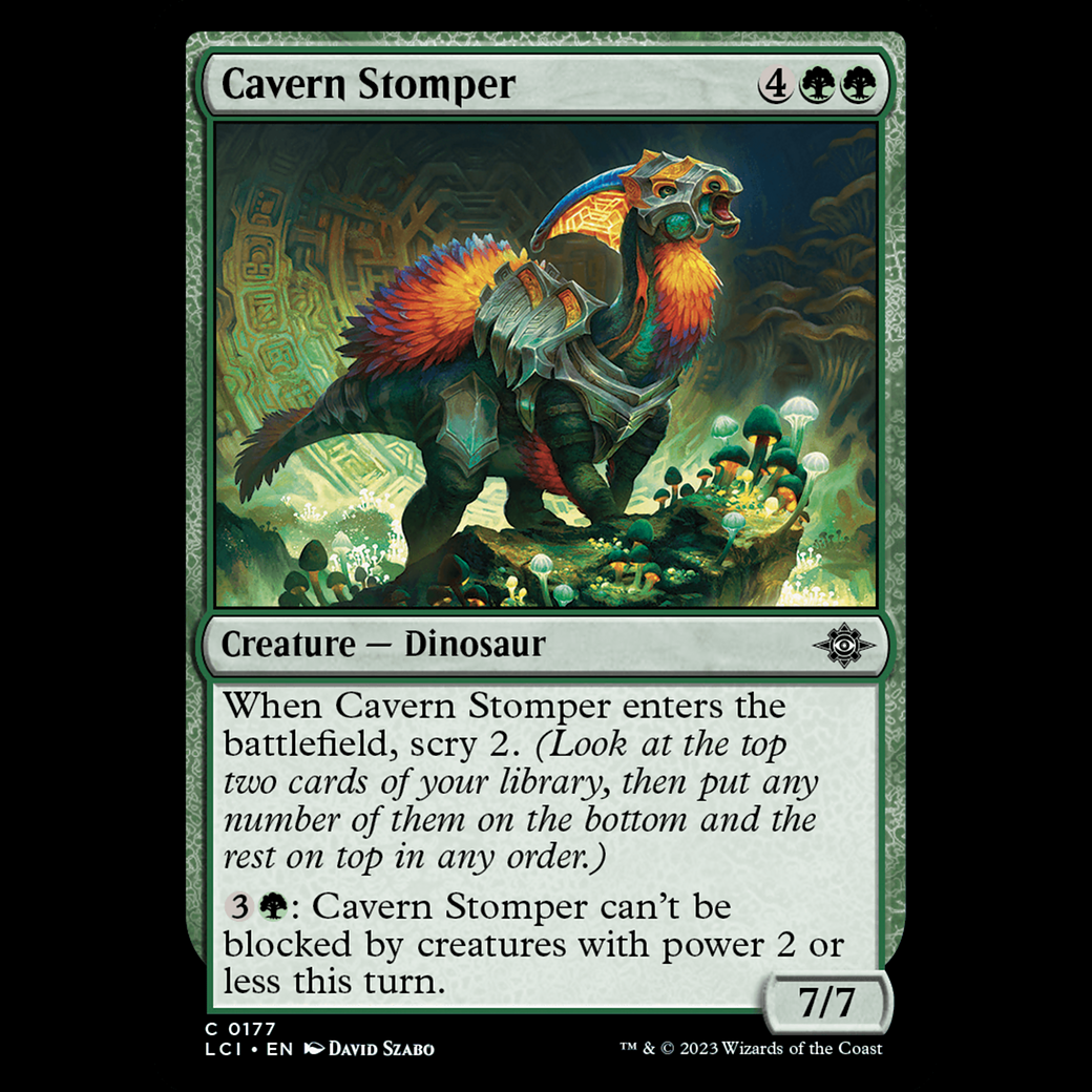 When Cavern Stomper enters the battlefield, scry 2. (Look at the top two cards of your library, then put any number of them on the bottom and the rest on top in any order.)